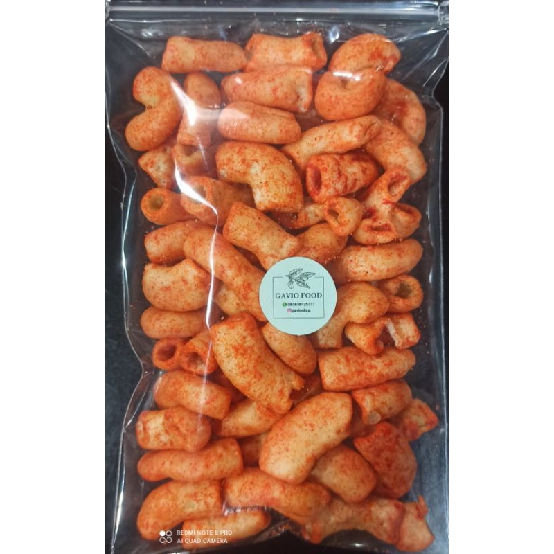 cemilan makaroni pedas cocok dijadikan cemilan bersama keluarga. pedesnya nagih. yuk diorder