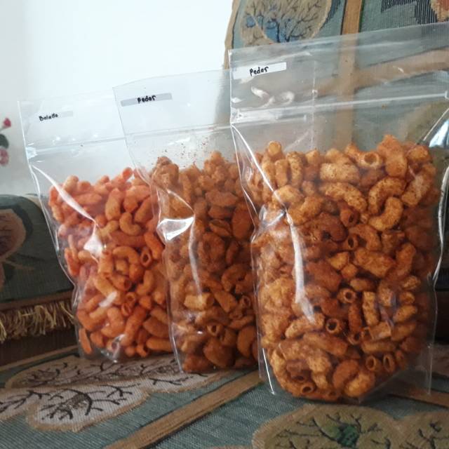 Makaroni gurih renyah, ready rasa : xtra pedas, pedas, balado, keju manis, jagung bakar, coklat