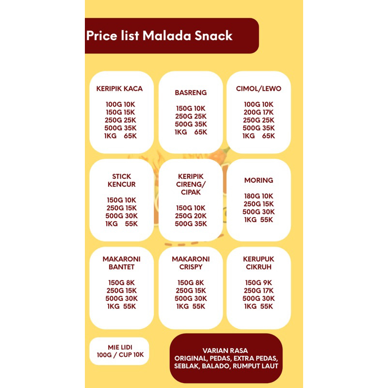 Malada Snack adalah produk makanan ringan yang enak dan gurihh.. bisa di variasikan dengan berbagai macam rasa.. diantaranya :