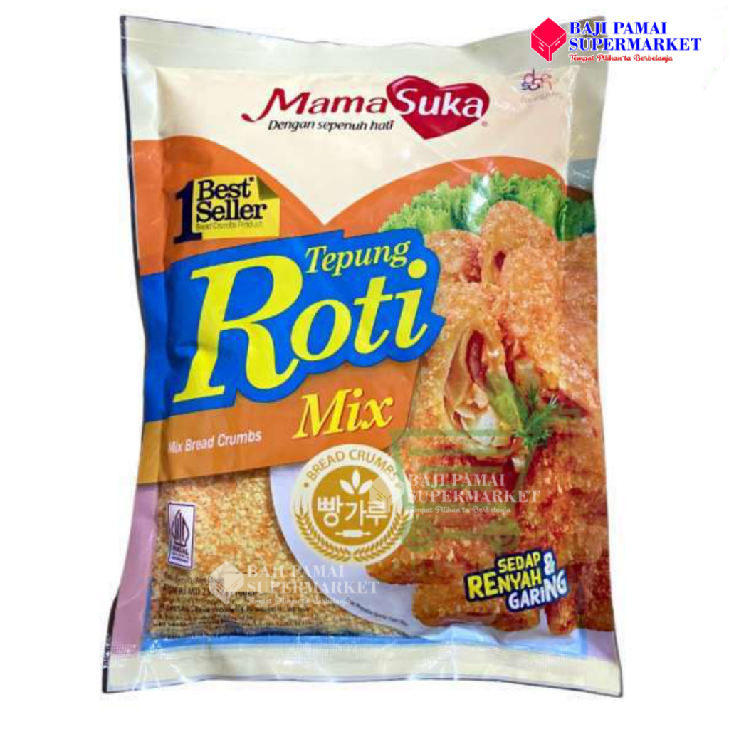 Tepung Roti Mix MamaSuka terbuat dari tepung roti tawar dengan bahan terigu berkualitas tinggi yang diolah sedemikan rupa sehingga menghasilkan serpihan remah bagus, garing dan harum khas roti tawar. Sangat cocok untuk membalur/melumuri aneka gorengan, udang, daging ayam filet, ikan, dan lainnya untuk menghasilkan gorengan dengan sensasi rasa khas.