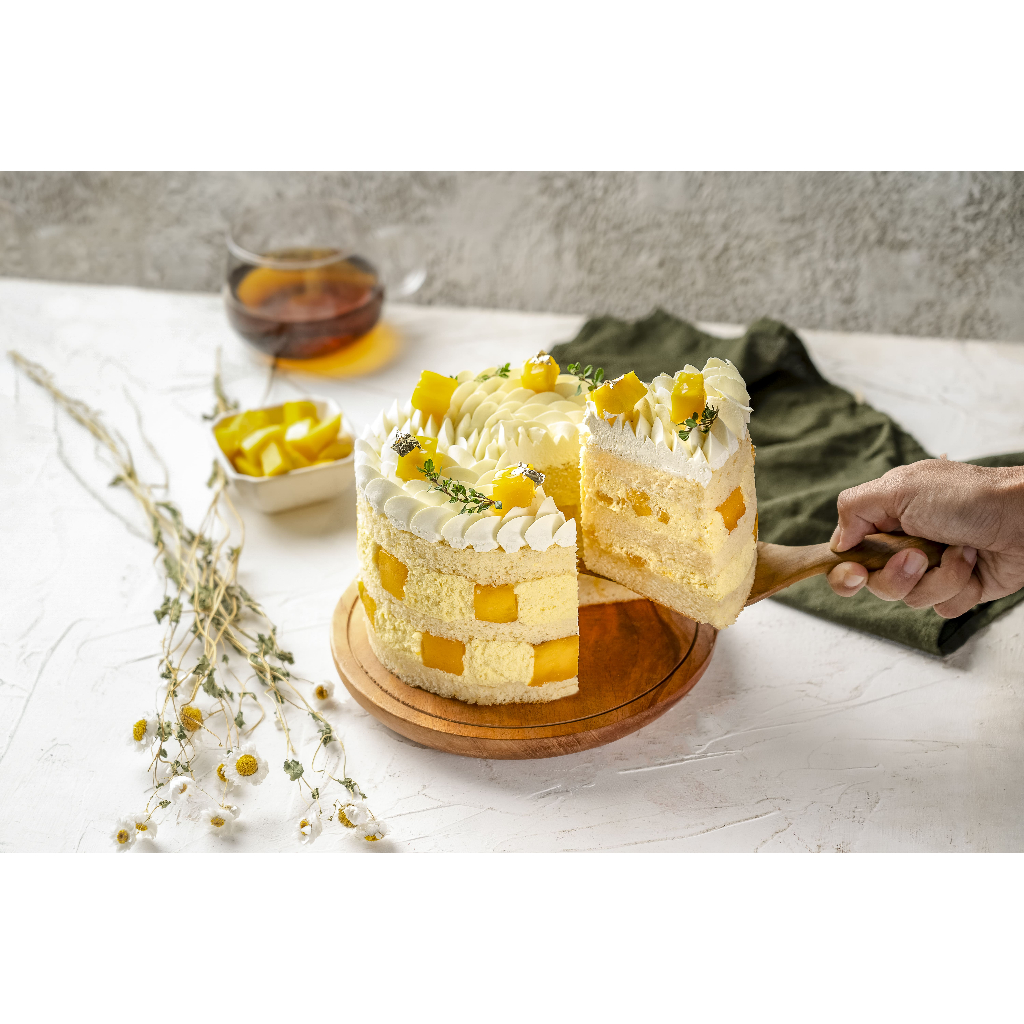 Rasa mangga impor sangat melengkapi kuenya yang manis dan lembut. Bolu vanila dengan krim segar mangga dan mangga segar pasti akan memanjakan lidah Anda. Di atasnya diberi isian krim segar mangga dan diakhiri dengan thyme dan daun emas dengan mangga segar.