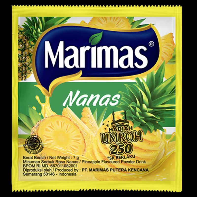 Marimas Nanas merupakan sebuah minuman serbuk yang menawarkan rasa yang menarik serta kaya akan kandungan yang pastinya baik untuk tubuh Anda. Selain mempunyai rasa yang manis dan menarik, minuman serbuk ini juga dibuat secara higienis, yang membuat aman untuk di konsumsi oleh siapapun.