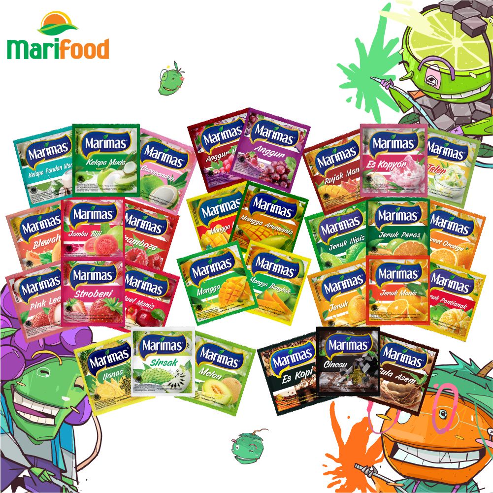 Marimas, minuman serbuk rasa buah yang terbuat dari gula asli, tanpa pengawet dan mengandung Vitamin-C yang baik untuk tubuhmu. Lengkap dengan 31 pilihan rasa yang bisa kamu campur suka-suka. Kombinasi Cincau - Jeruk Nipis, Cocopandan - Jeruk Manis, Anggur - Mangga, atau rasa apapun itu kreasikan kombinasi favoritmu!!