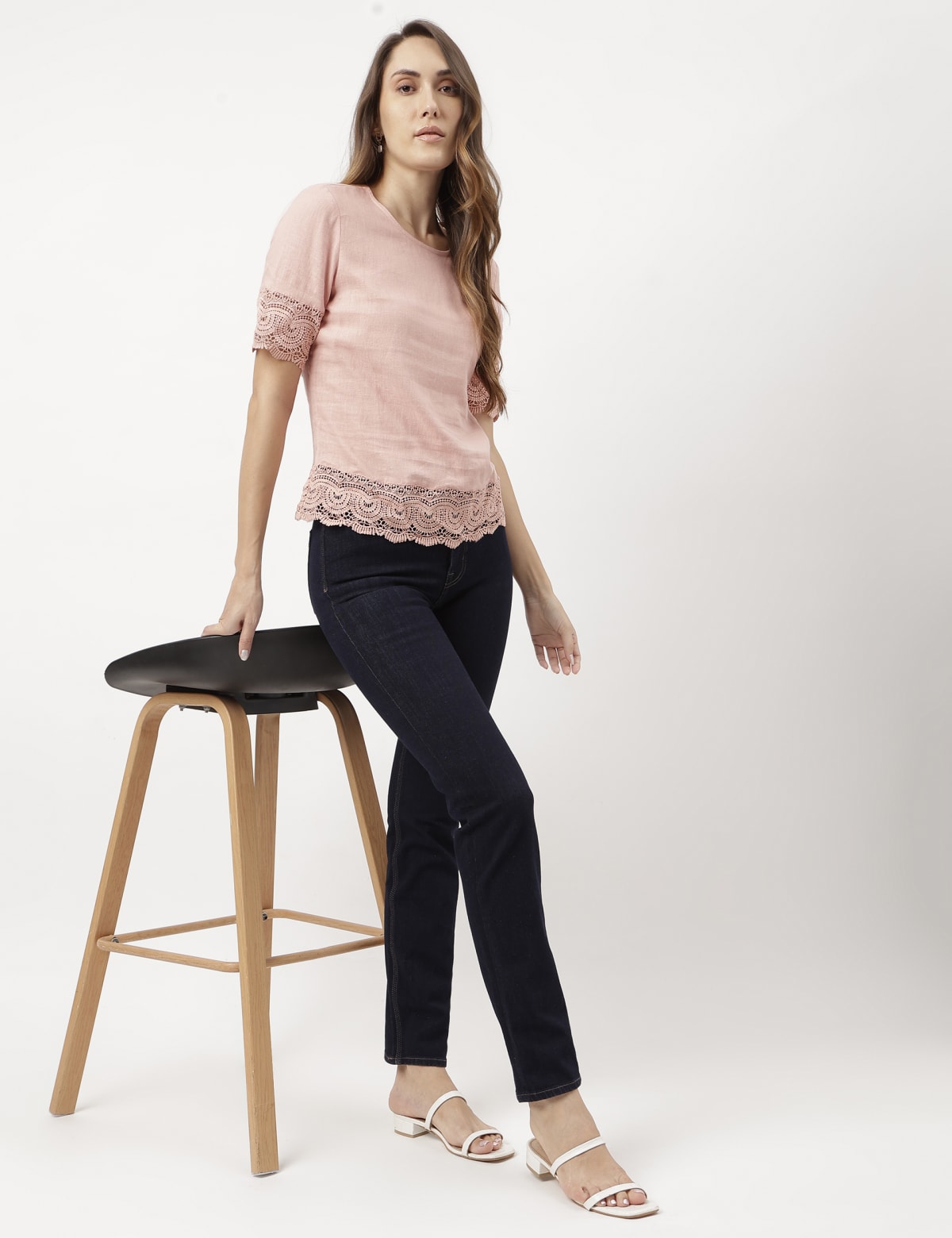 Elevate your wardrobe with the women's top in a delightful rose hue. This top combines elegance and comfort seamlessly. With a classic round neck and short sleeves it's perfect for a casual yet stylish look. The lace hem sleeves add a touch of sophistication. Designed for comfort it offers a regular fit and is crafted from pure viscose ensuring both softness and breathability. Whether you're heading to a brunch date or a casual gathering this top's blend of style and comfort will keep you looking fabulous.