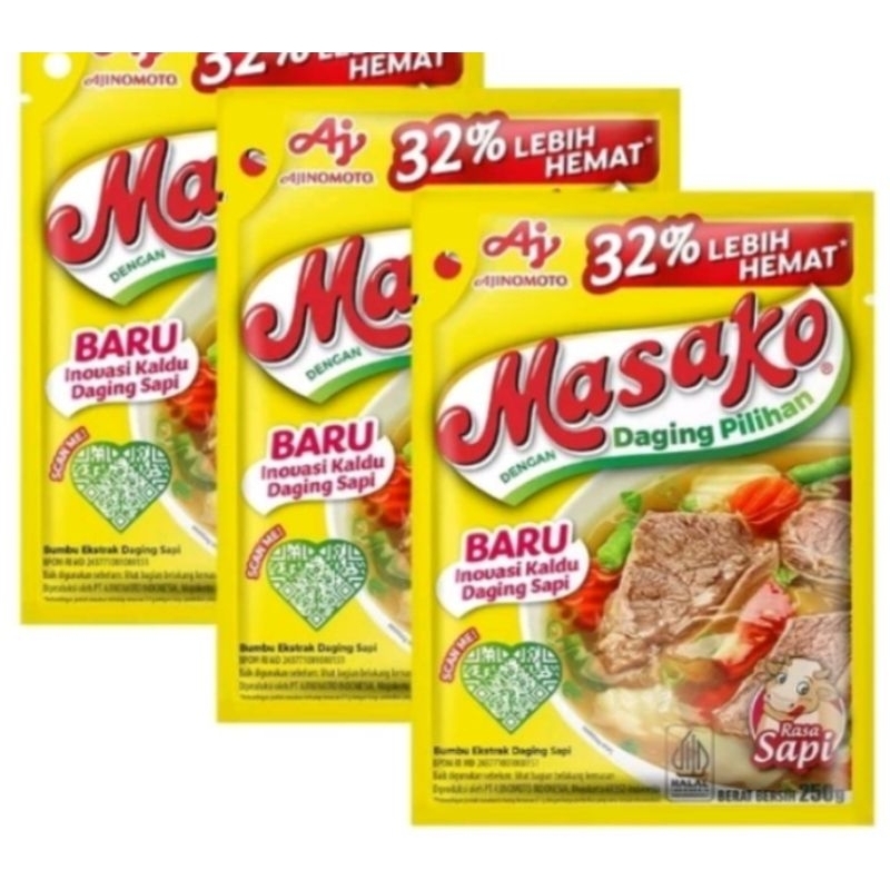 Masako® bumbu ekstrak daging sapi, dibuat dengan daging sapi yang berkualitas serta kombinasi bumbu dan rempah pilihan. Menghasilkan rasa kaldu yang lezat, seperti kaldu buatan sendiri di rumah, untuk masakan sehari-hari dengan cara yang mudah dan praktis. Masako® sajikan #KenikmatanHakiki untuk keluarga, makanan jadi makin enak dan lezat, jadi pingin tambah lagi! Kandungan garam/ natrium 520 mg per sajian Sesuai dengan angka kecukupan gizi yang direkomendasikan yaitu