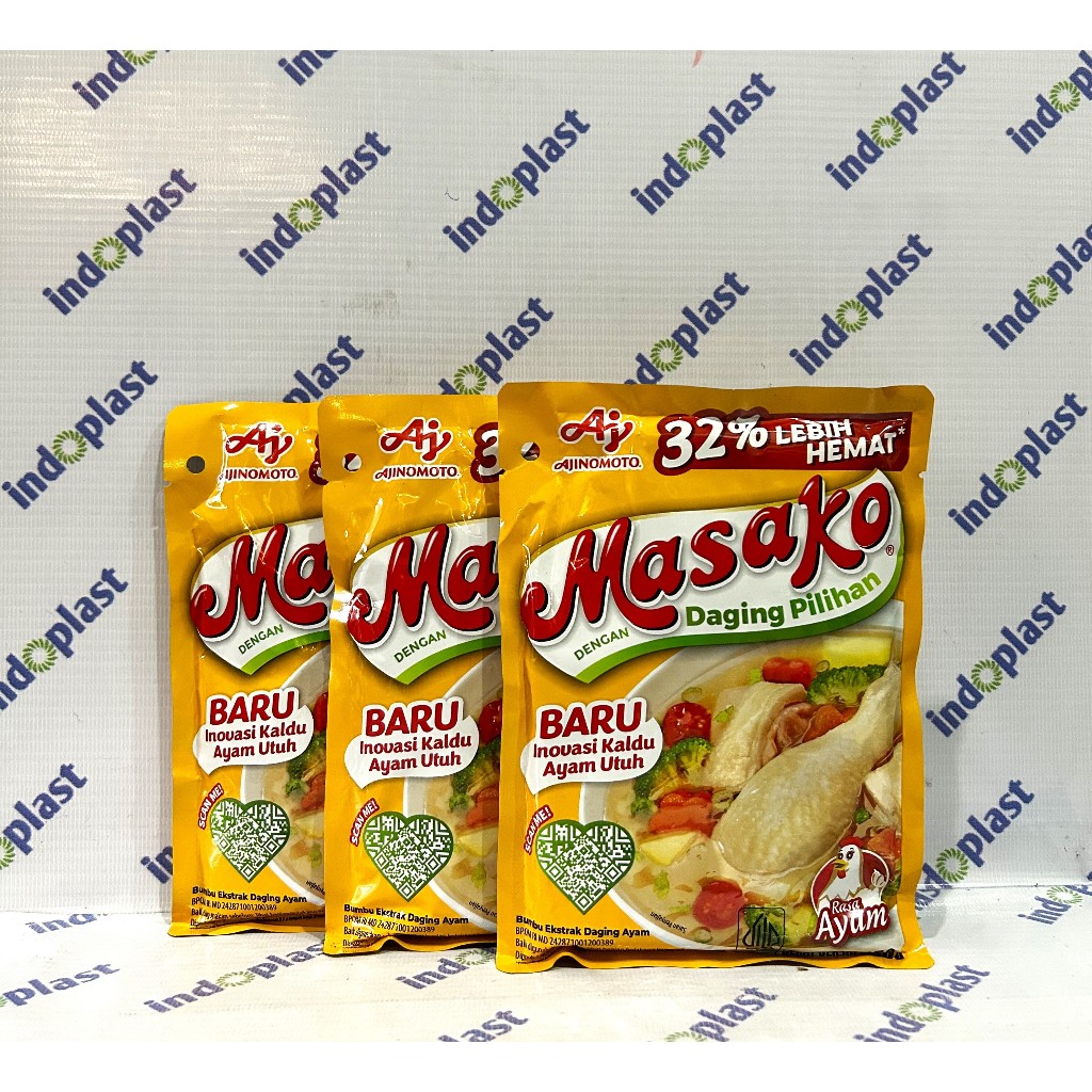 Selamat datang di toko indoplast Masako® bumbu ekstrak daging sapi, dibuat dengan daging sapi yang berkualitas serta kombinasi bumbu dan rempah pilihan. Menghasilkan rasa kaldu yang lezat, seperti kaldu buatan sendiri di rumah, untuk masakan sehari-hari dengan cara yang mudah dan praktis. Masako® sajikan #KenikmatanHakiki untuk keluarga, makanan jadi makin enak dan lezat, jadi pingin tambah lagi! Kandungan garam/ natrium 520 mg per sajian Sesuai dengan angka kecukupan gizi yang direkomendasikan yaitu