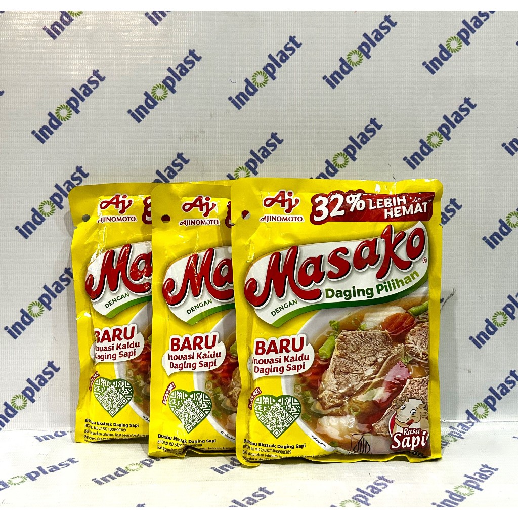 Selamat datang di toko indoplast Masako® bumbu ekstrak daging sapi, dibuat dengan daging sapi yang berkualitas serta kombinasi bumbu dan rempah pilihan. Menghasilkan rasa kaldu yang lezat, seperti kaldu buatan sendiri di rumah, untuk masakan sehari-hari dengan cara yang mudah dan praktis. Masako® sajikan #KenikmatanHakiki untuk keluarga, makanan jadi makin enak dan lezat, jadi pingin tambah lagi! Kandungan garam/ natrium 520 mg per sajian Sesuai dengan angka kecukupan gizi yang direkomendasikan yaitu