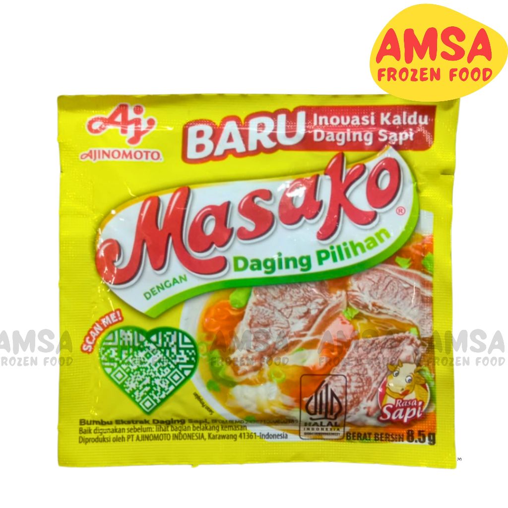 Masako® Bumbu Kaldu Sapi Penyedap Rasa 8.5g Masako® bumbu ekstrak daging ayam, dibuat dengan daging ayam yang berkualitas serta kombinasi bumbu dan rempah pilihan. Menghasilkan rasa kaldu yang lezat, seperti kaldu buatan sendiri di rumah, untuk masakan sehari-hari dengan cara yang mudah dan praktis. Masako® sajikan #KenikmatanHakiki untuk keluarga, makanan jadi makin enak dan lezat, jadi pingin tambah lagi! Kandungan garam/ natrium 520 mg per sajian Sesuai dengan angka kecukupan gizi yang direkomendasikan yaitu