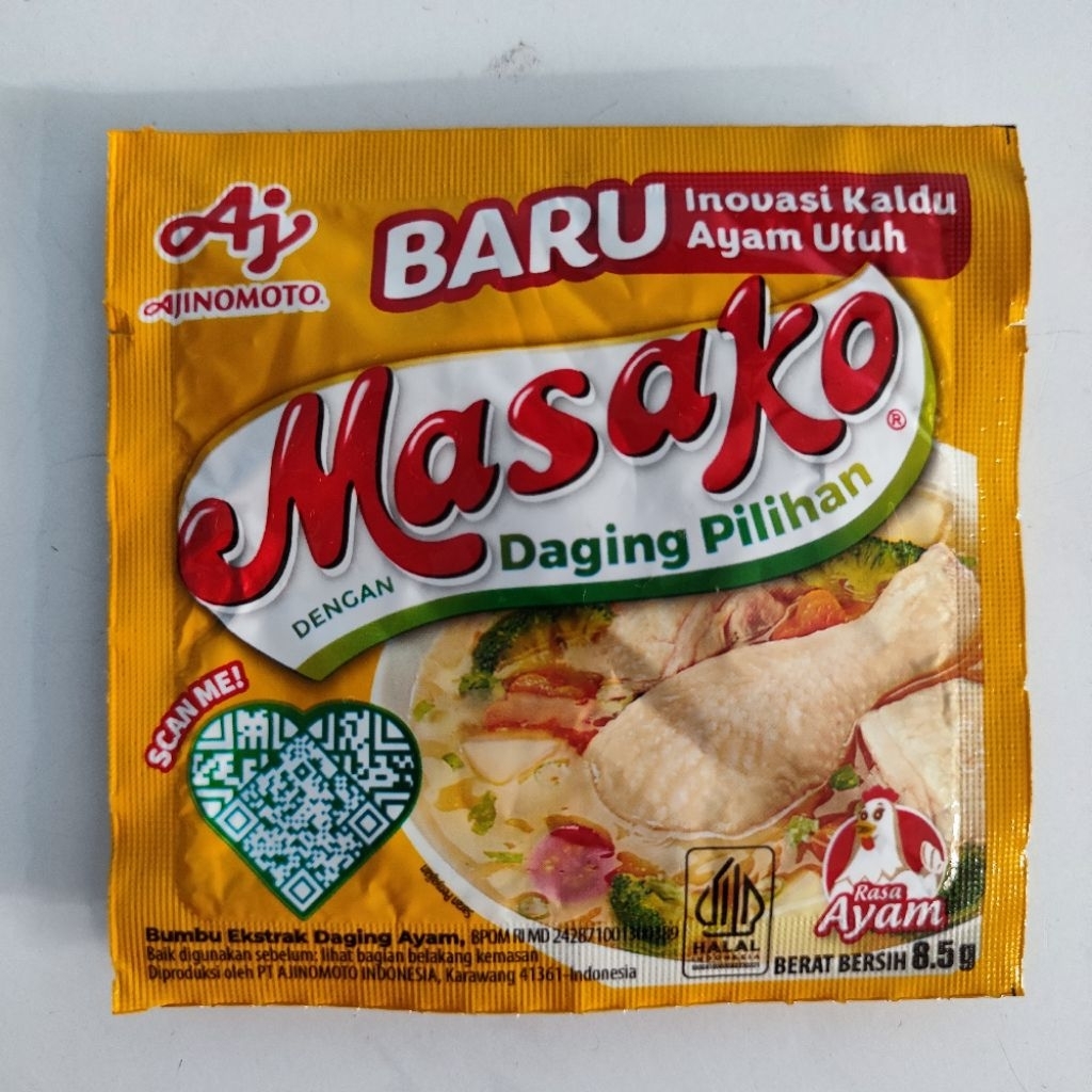 Masako ayam dengan inovasi kaldu ayam utuh. Kemasan 8,5g.