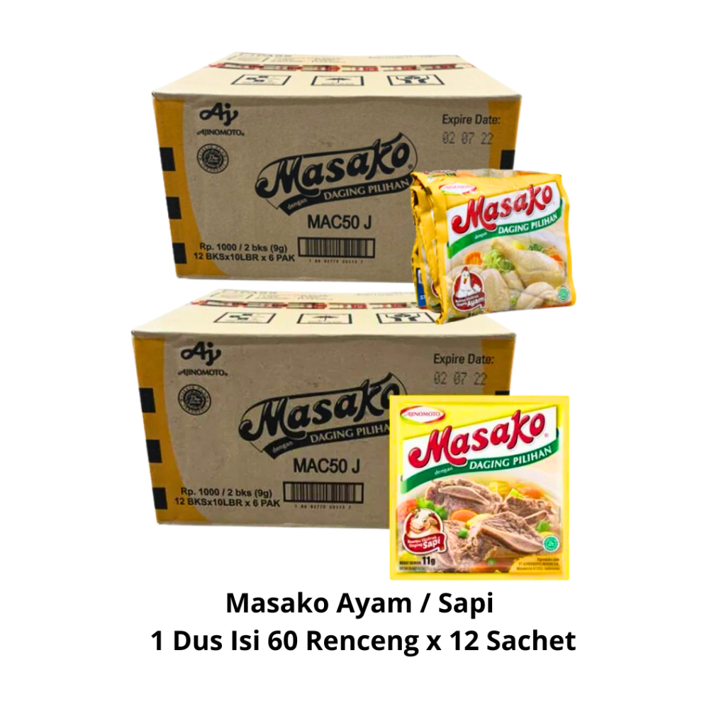 Masako ayam dan sapi merupakan bumbu penyedap rasa yang tersedia dalam kemasan dus dan berisi 720 sachet/ 60 Renceng Berikut beberapa informasi mengenai Masako ayam dan sapi: