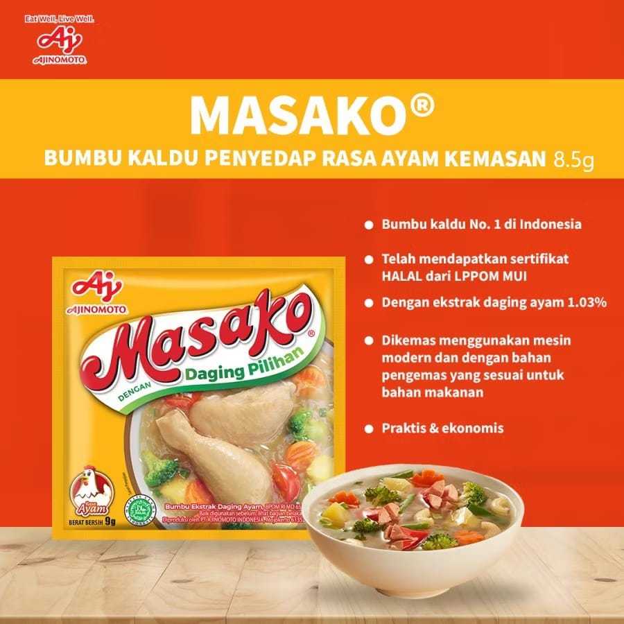 1 Renceng isi 10 pcs Masako bumbu ekstrak daging ayam, dibuat dengan daging ayam yang berkualitas serta kombinasi bumbu dan rempah pilihan. Menghasilkan rasa kaldu yang lezat, seperti kaldu buatan sendiri di rumah, untuk masakan sehari-hari dengan cara yang mudah dan praktis. Masako sajikan #KenikmatanHakiki untuk keluarga, makanan jadi makin enak dan lezat, jadi pingin tambah lagi! Kandungan garam/ natrium 520 mg per sajian Sesuai dengan angka kecukupan gizi yang direkomendasikan yaitu