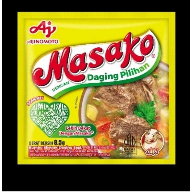 Kaldu Rasa Sapi merk Masako ukuran kemasan 8,5 gram per sachet, sebanyak 1 renteng (12 sachet).