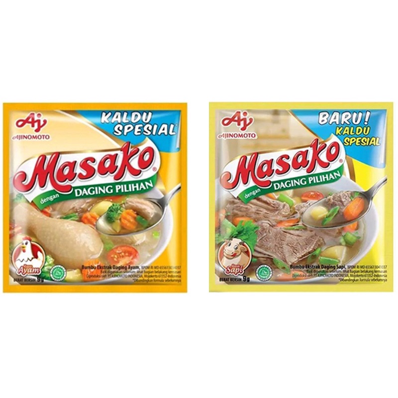 Penyedap Rasa Masako merupakan bumbu kaldu spesial yang dibuat dengan perpaduan sempurna antara daging segar berkualitas dan rempah pilihan, sehingga memberikan rasa dan aroma masakan dari daging asli sama seperti kaldu buatan di rumah. Ekstrak daging yang kuat dengan rasa asin dan gurih membuat masakan jauh lebih lezat. Kaldu ini diolah dengan teknologi tinggi dan higienis, oleh karena itu bumbu kaldu ini mudah terserap dalam jenis masakan baik hidangan berkuah maupun aneka tumisan. Bahan-bahan yang di gunakan terdiri dari Garam, gula, pengatur rasa (mononatrium glutamat, dinatrium inosinat & dinatrium guanilat), ekstrak daging 1.1% (mengandung antioksidan Dl-alfa tokoferol, lemak (mengandung antioksidan DL alfa tokoferol), bawang putih, perisa identik alami daging (mengandung antioksidan alfa tokoferol, bawang merah dan protein kedelai terhidrolisa.