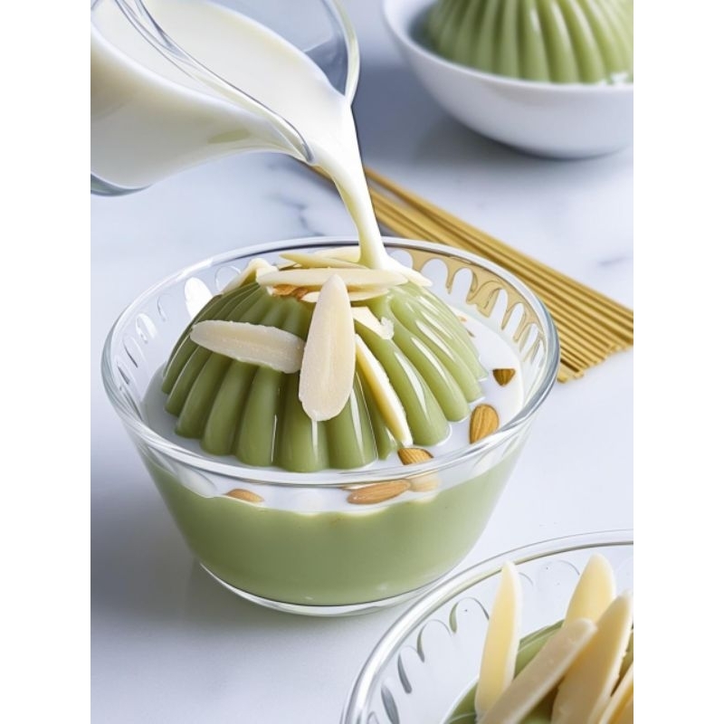 Puding Matcha yang lembut disiram dengan vla vanila dan almond slice
