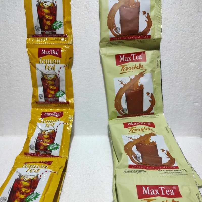 Nikmati max tea dengan 2 varian, baik lemon tea maupun teh tarik. Harga yg tertera adalah harga 1 renteng. 1 renteng= 10 sachet.