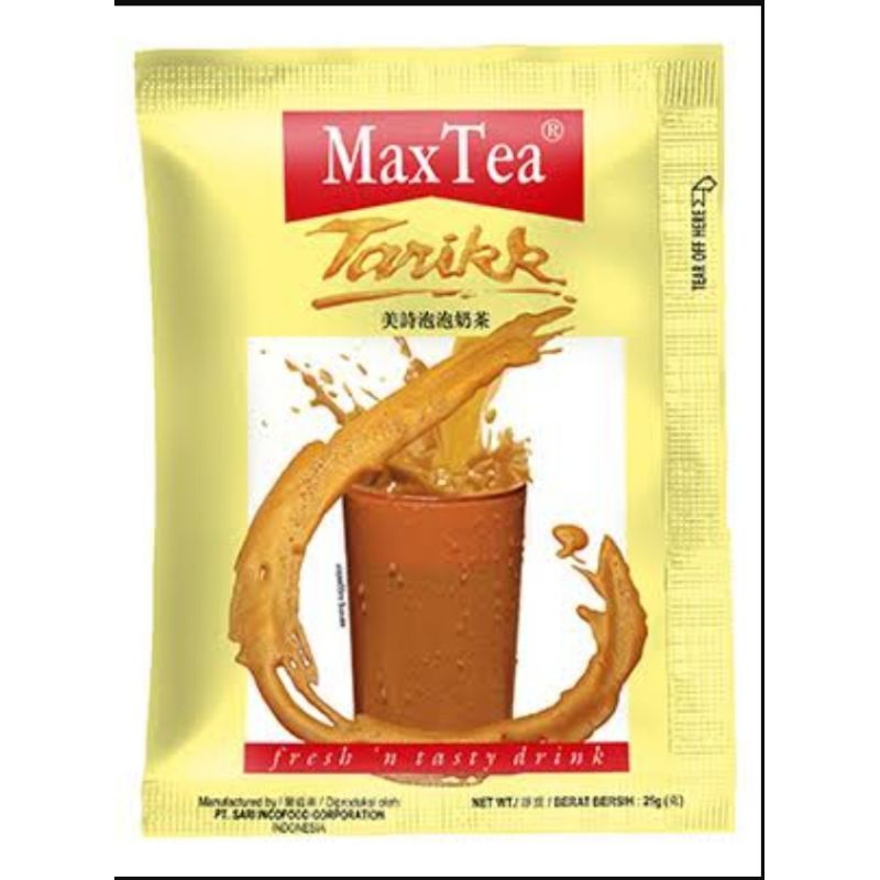 MaxTea Tarikk 10pc x 25g merupakan salah satu produk teh dari Max Tea teh instan dengan berat 25g. Teh tarik MaxTea ini dihasilkan dari perpaduan teh dan susu yang diolah dengan cara yang unik seperti teh tarik asli dari warisan budaya Melayu. Selanjutnya, diproses dalam teknologi terbaik sehingga menghasilkan teh tarik instan dengan cita rasa yang asli dan istimewa. Kehangatan dan kelezatannya kini hadir untuk Anda dengan cara yang lebih mudah dalam setiap sachetnya. Praktis. Max Tea Tarikk yang disajikan hangat akan menghangatkan suasana berkumpul Anda bersama orang-orang tersayang, membicarakan berbagai hal menyenangkan dan membahagiakan. Nikmati rasa teh tarik asli dalam segelas MaxTea Tarikk setiap saat Anda mau.