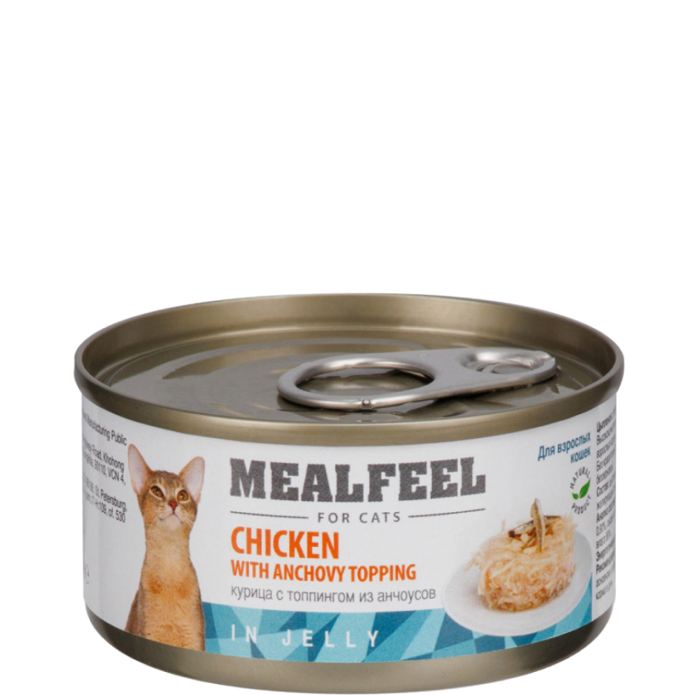 Mealfeel Влажный корм (консервы) для кошек, цыпленок с топпингом из анчоусов в желе, 85 гр.