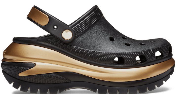 The Classic Clog gets a seriously eye-catching makeover. Introducing the Classic Mega Crush Metallic Clog, featuring everything you love about Mega Crush with a bold metallic treatment on the midsole. Just like the original, the backstrap and upper are built to be personalized with Jibbitz™ charms. Are you ready for your new crush? Mega Crush Metallic Clog Details: Metallic treatment on midsole Unique 2.5-inch/ 6.3cm height, measured from floor to heel rest Updated, enhanced rubber tread Textured detailing around the heel, toe box and collar Customizable with Jibbitz™ charms Iconic Crocs Comfort™: Lightweight. Flexible. 360-degree comfort.