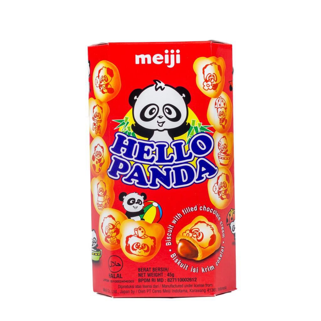 Nikmati kue biskuit coklat yang menggoda untuk minum teh pagi atau sore bersama Meiji`s Chocolate Hello Panda. Masing-masing biskuit berukuran satu gigitan ini memiliki gambaran lucu tentang panda yang bermain (termasuk sepak bola, bola voli, dan berperahu), sementara bagian dalamnya diisi dengan kue cokelat ganache yang kaya dan lembut.
