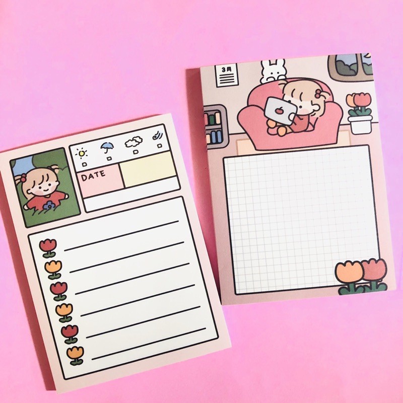 Memo tanpa perekat dengan gambar yang lucu, kertasnya bagus dan warnanya girly :) Bisa menggunakan klip kertas atau direkatkan dengan washi tape favorit!