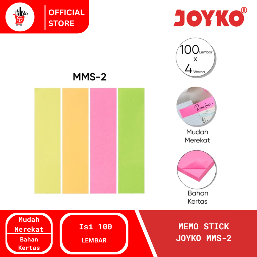 STICKY NOTE JOYKO MMS-2 (1 PCS) SPESIFIKASI : - Ukuran Produk ( Sheet Per Warna ) : Panjang 75 mm x 18.75 mm - Jumlah : 100 Sheet ( Per Warna ) - 4 Warna - Bahan Kertas - Harga per PCS >>> NOTE