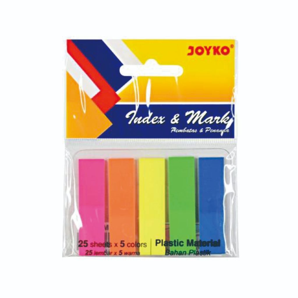 Penanda index plastik dengan ukuran 4.5 x 1.2 cm per warna. Tersedia dalam 5 warna: pink, oranye, kuning, hijau, dan biru. Setiap warna berisi 25 lembar.