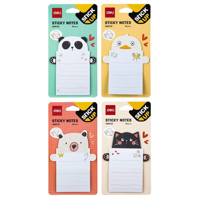 Post it / Stick notes kreatif & unik merek Deli dengan bentuk karakter lucu. Bagian bawah dapat dilipat setelah ditulis untuk membentuk gambar amplop, dan tangan kiri & kanan juga dapat dilipat sehingga amplop tersebut terlihat seperti dipegang oleh karakter lucu. Perekat yang kuat dan tahan lama tetapi bersih & dapat direposisi Harga tertera merupakan harga per pack (isi 15 lembar)