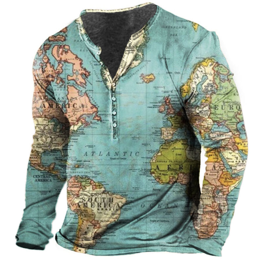 Men' World Map Henley Long Sleeve Training Shirt