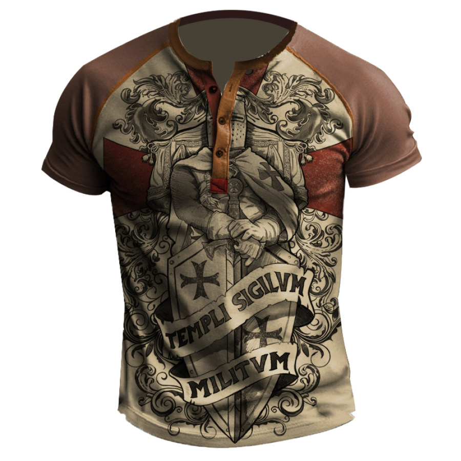 Men's Color Panel Templars Graphic Print Henley Collar T-Shirt