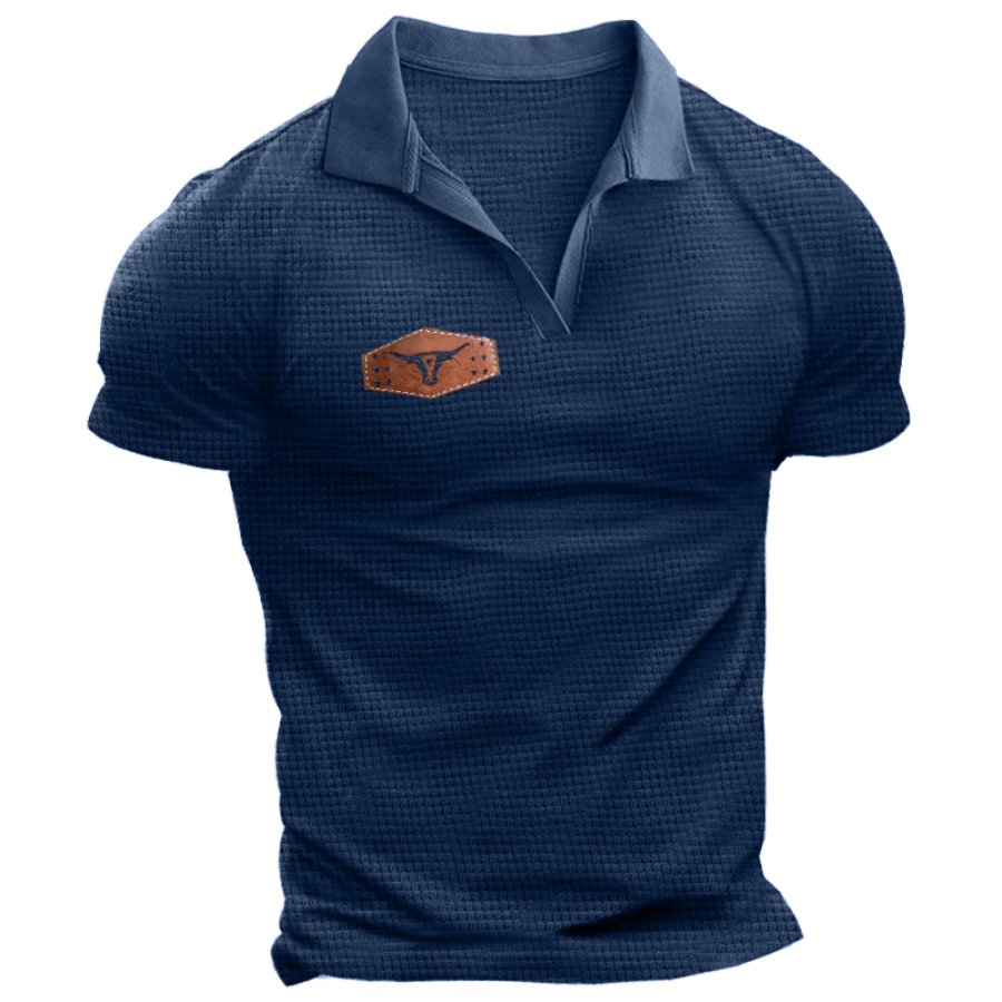 Men's Cowboy Leather Label V-neck Waffle Yellowstone Dutton Ranch T-shirt Threaded Solid Color T-shirt