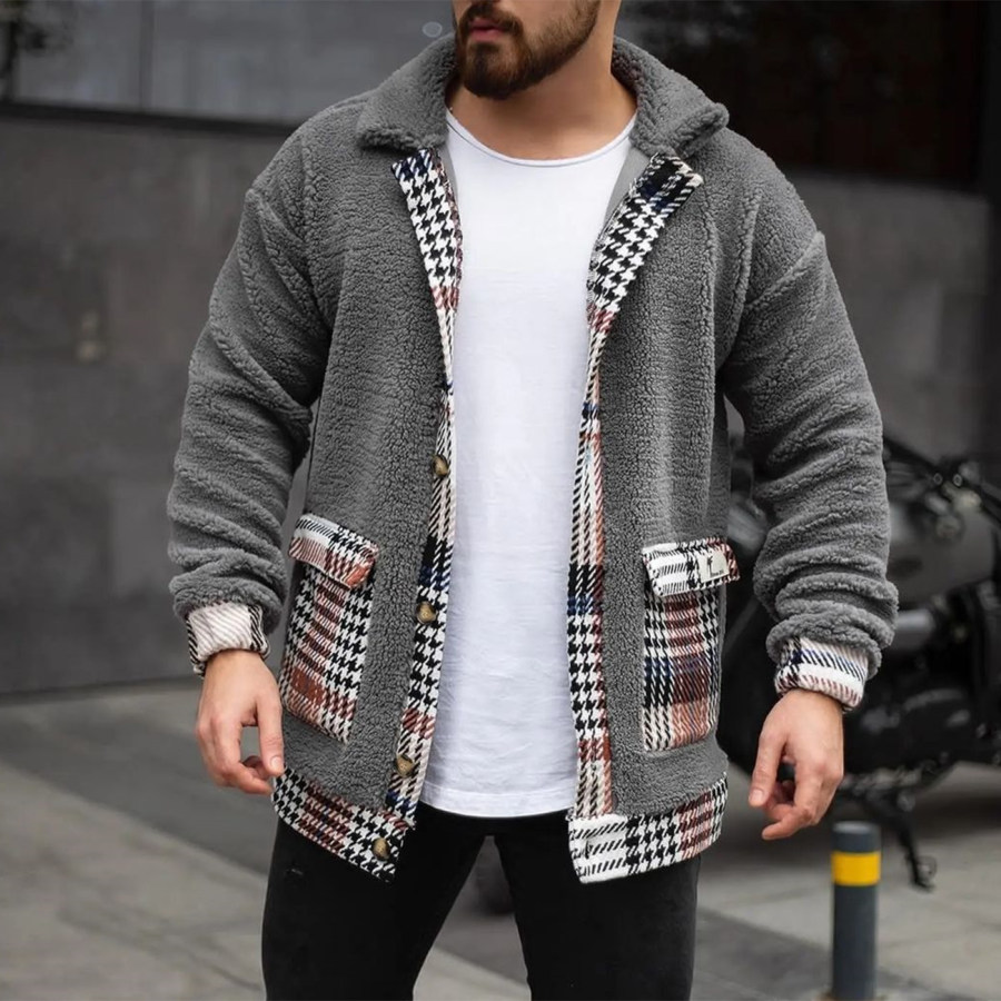 Men's Fashion Houndstooth Colorblock Fleece Cardigan Jacket