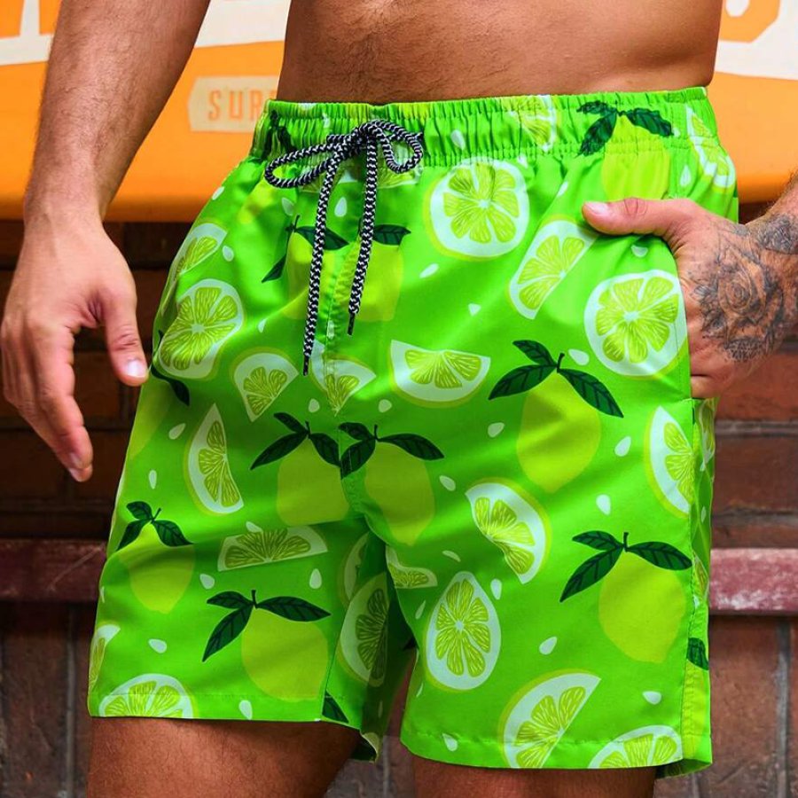 shorts,men's lemon print drawstring waist swim trunks