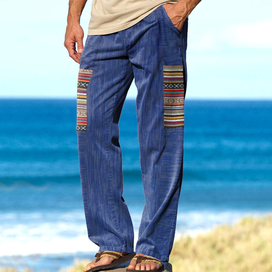 Men's Linen Contrasting Patchwork Print Boho Pants