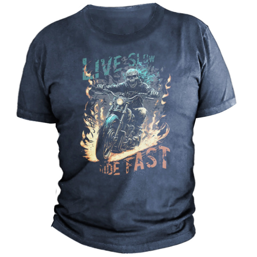 Men's Live Slow Ride Fast Skull Motorcycle Print Short Sleeve T-Shirt