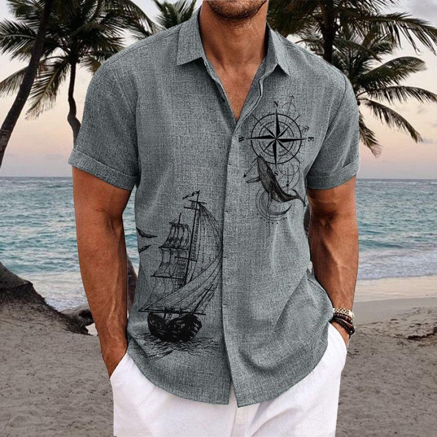 Men's Nautical Compass Print Lapel Button Linen Shirt