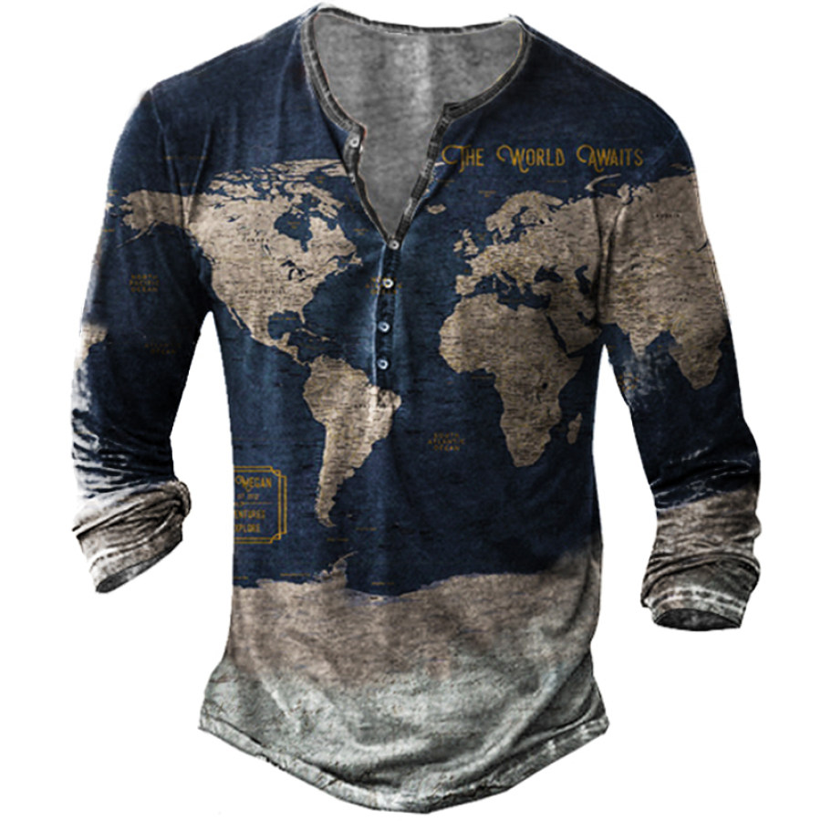 tees & shirts,men's outdoor map print henley shirt