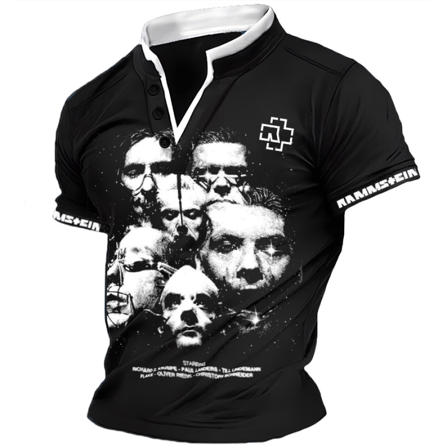 Men's Rammstein Cuff Text Band Members Print V-neck Splicing Short Sleeved T-shirt