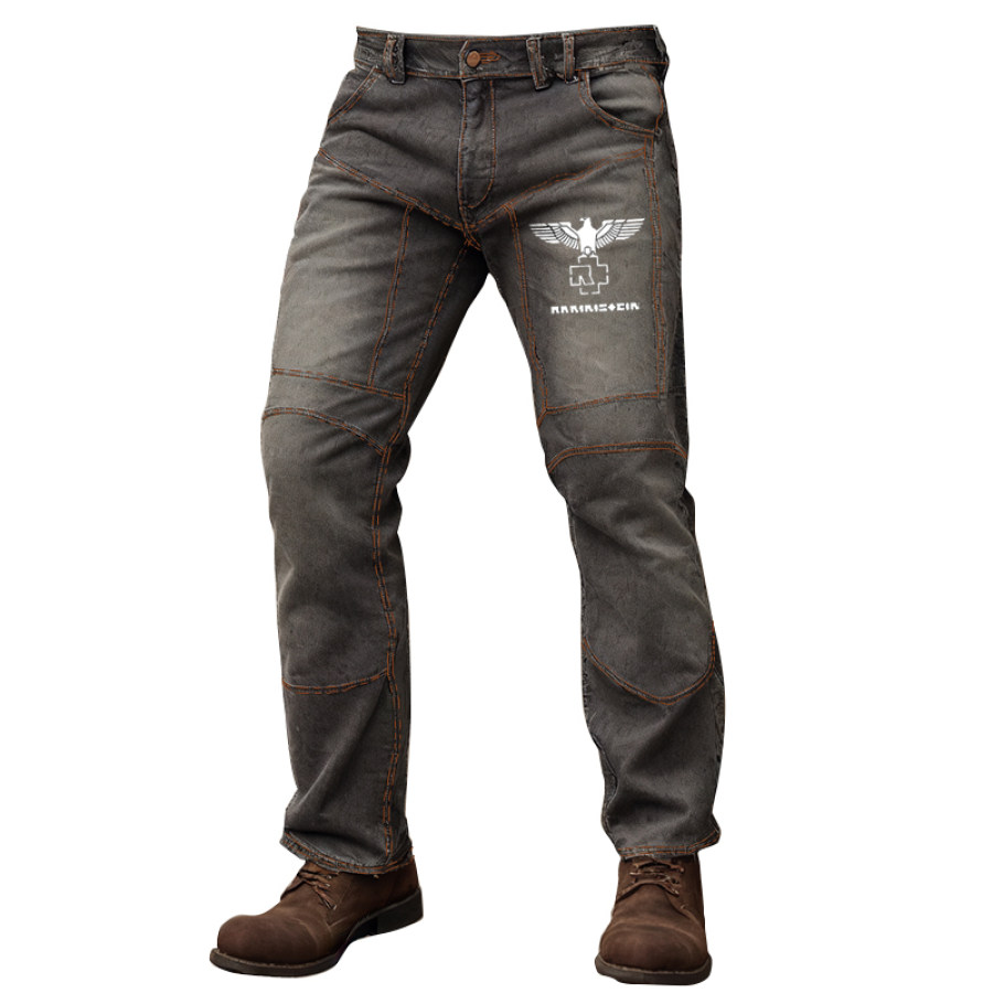 Men's Rammstein Washed Sewing Double Pressure Line Brown Contrasting Denim Jeans