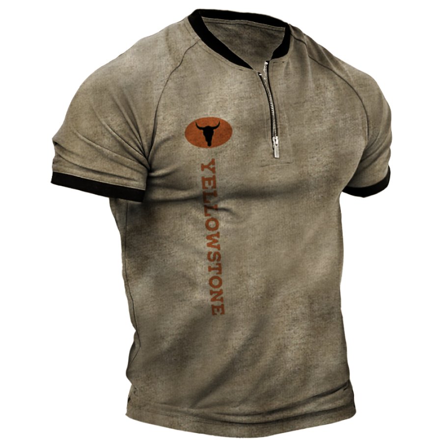 t-shirts,men's retro color block yellowstone print zipper collar t-shirt polo