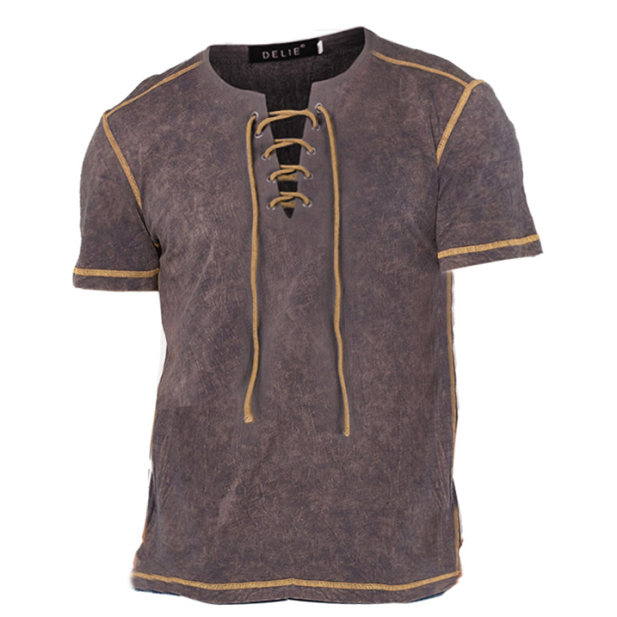 Men's Retro Contrast Drawstring V Neck Short Sleeve T-Shirt