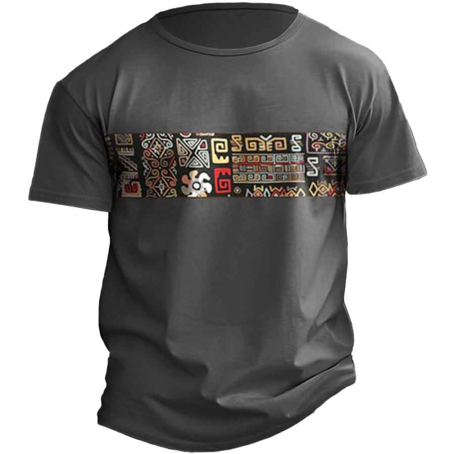 Men's Retro Ethnic Print Color Block Round Neck T-Shirt