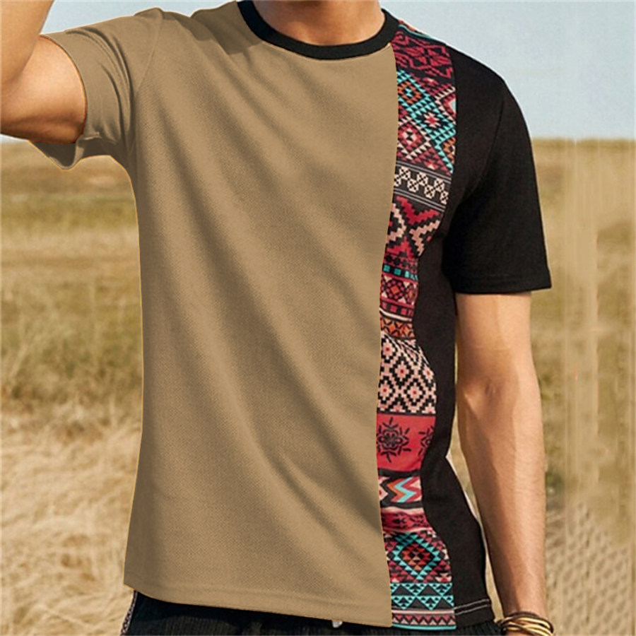 Men's Retro Ethnic Print Color Block Round Neck T-Shirt