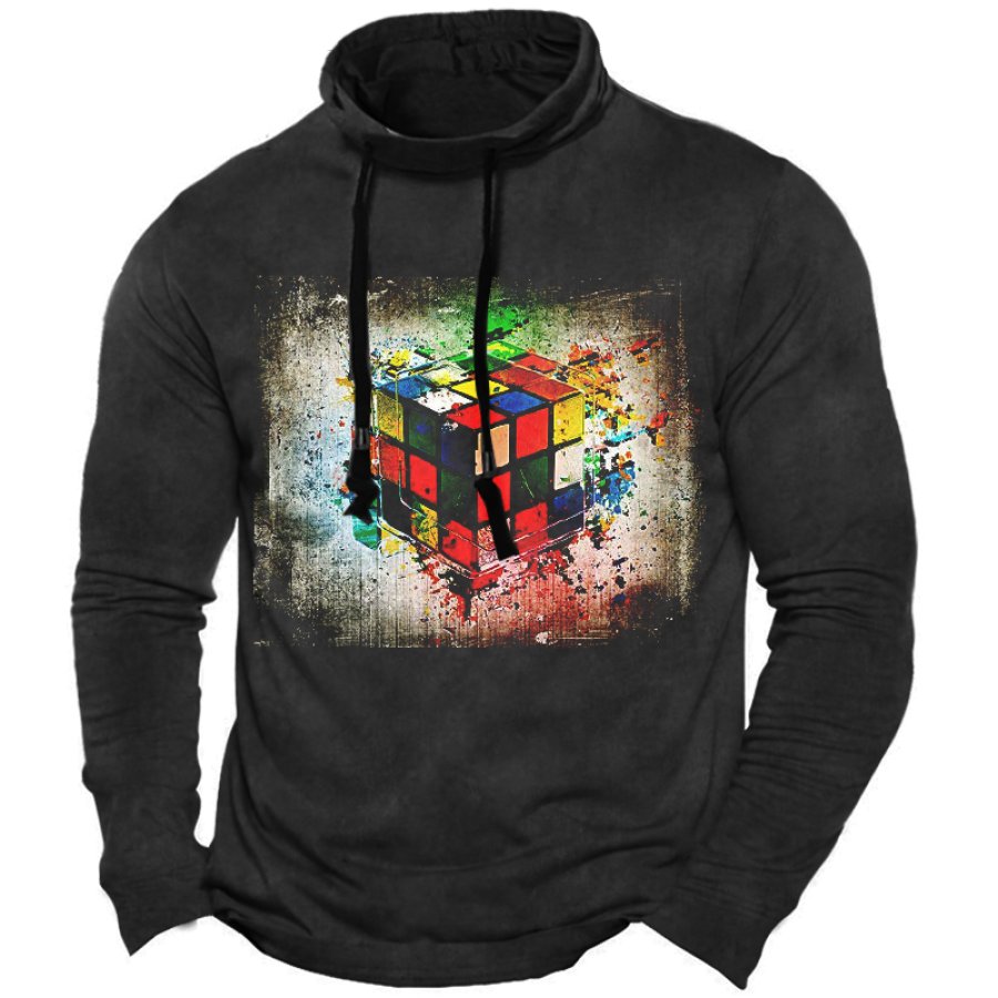 Men's Retro Large Puzzle Cubes Splashed Ink Drawstring Mock Neck Long Sleeve T-Shirt