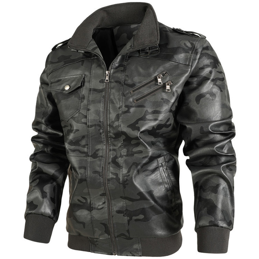 Men's Retro Warm Windproof Camouflage Motorcycle Washed Leather Jacket