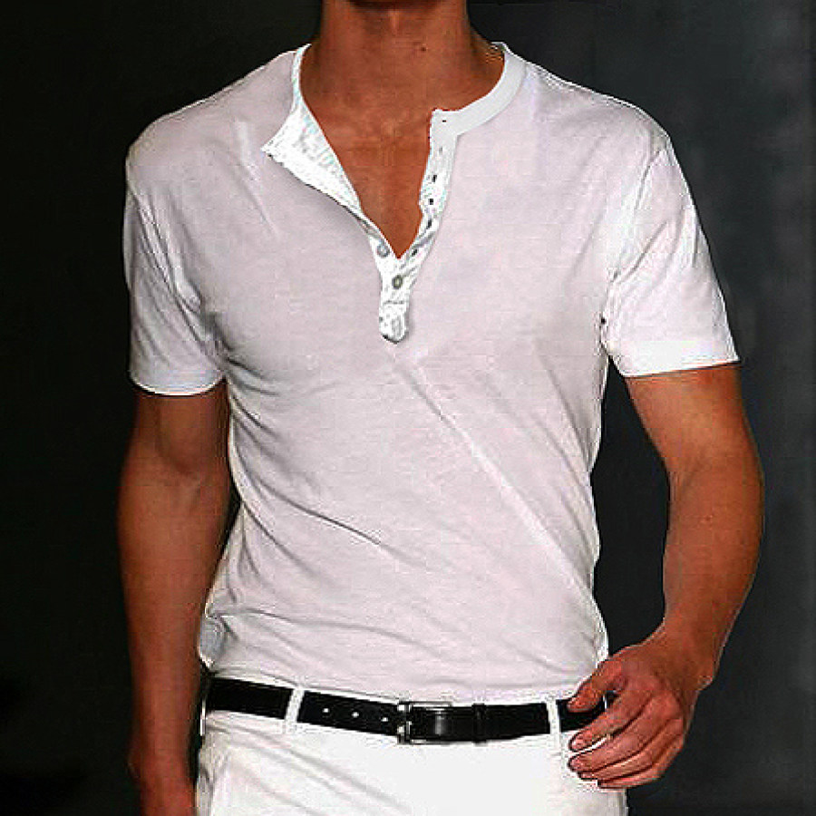 Men's Solid Color Basic Henley Collar Breathable Cotton T-Shirt