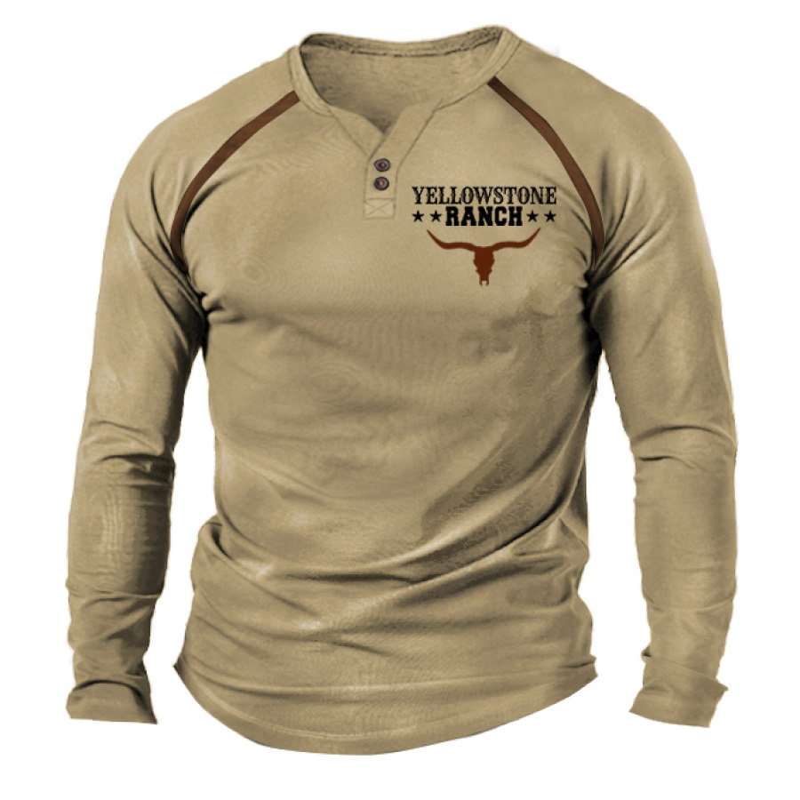 t-shirts,men's t-shirt henley yellowstone ranch print long sleeve contrast color daily tops