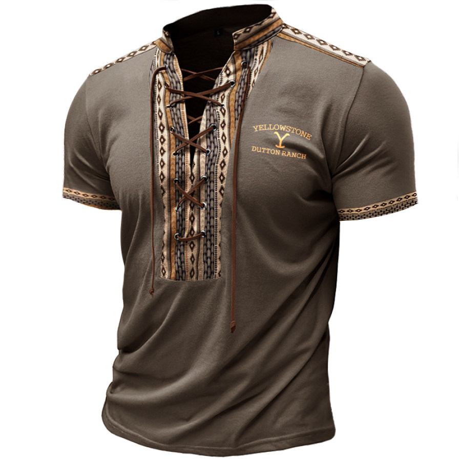 t-shirts,men's yellowstone bohemian style collar with drawstring short sleeves