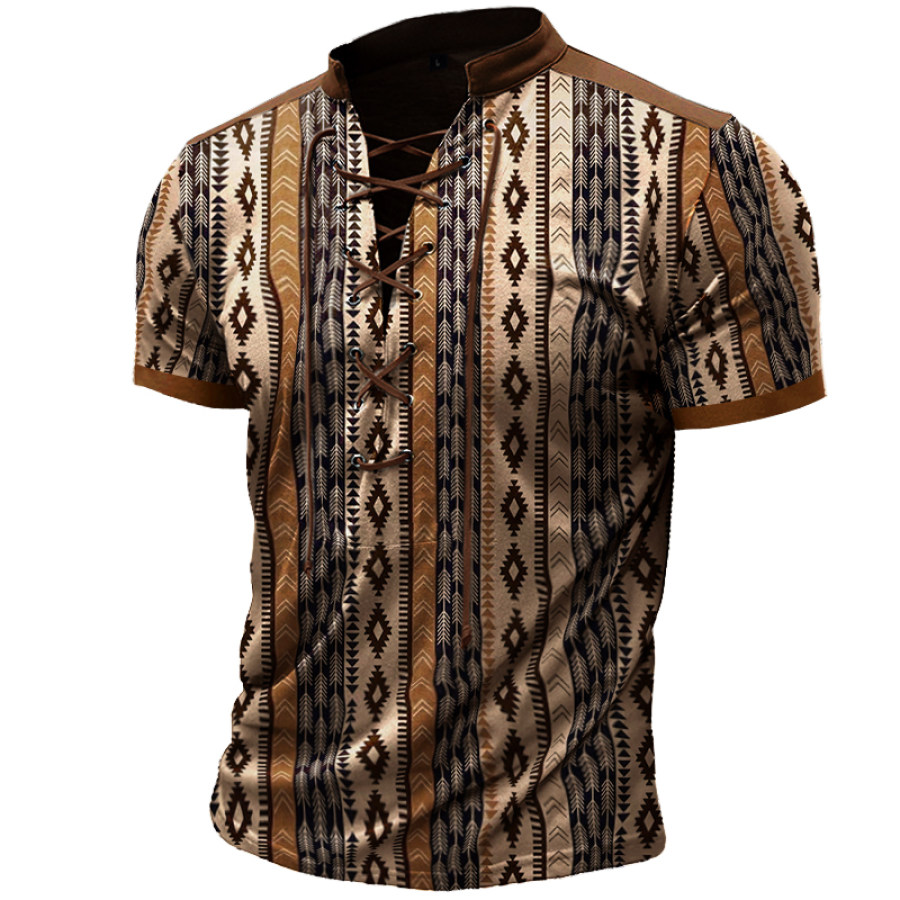 Men's Yellowstone Bohemian Style Suede Collar With Drawstring Short Sleeves