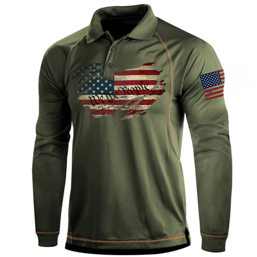 Men American Flag Raglan Long Sleeve Polo Shirt