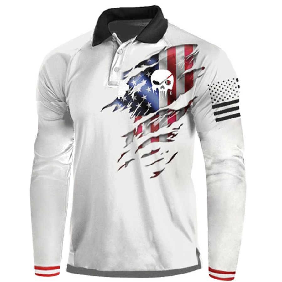 Men American Flag Skull Raglan Long Sleeve Polo Shirt